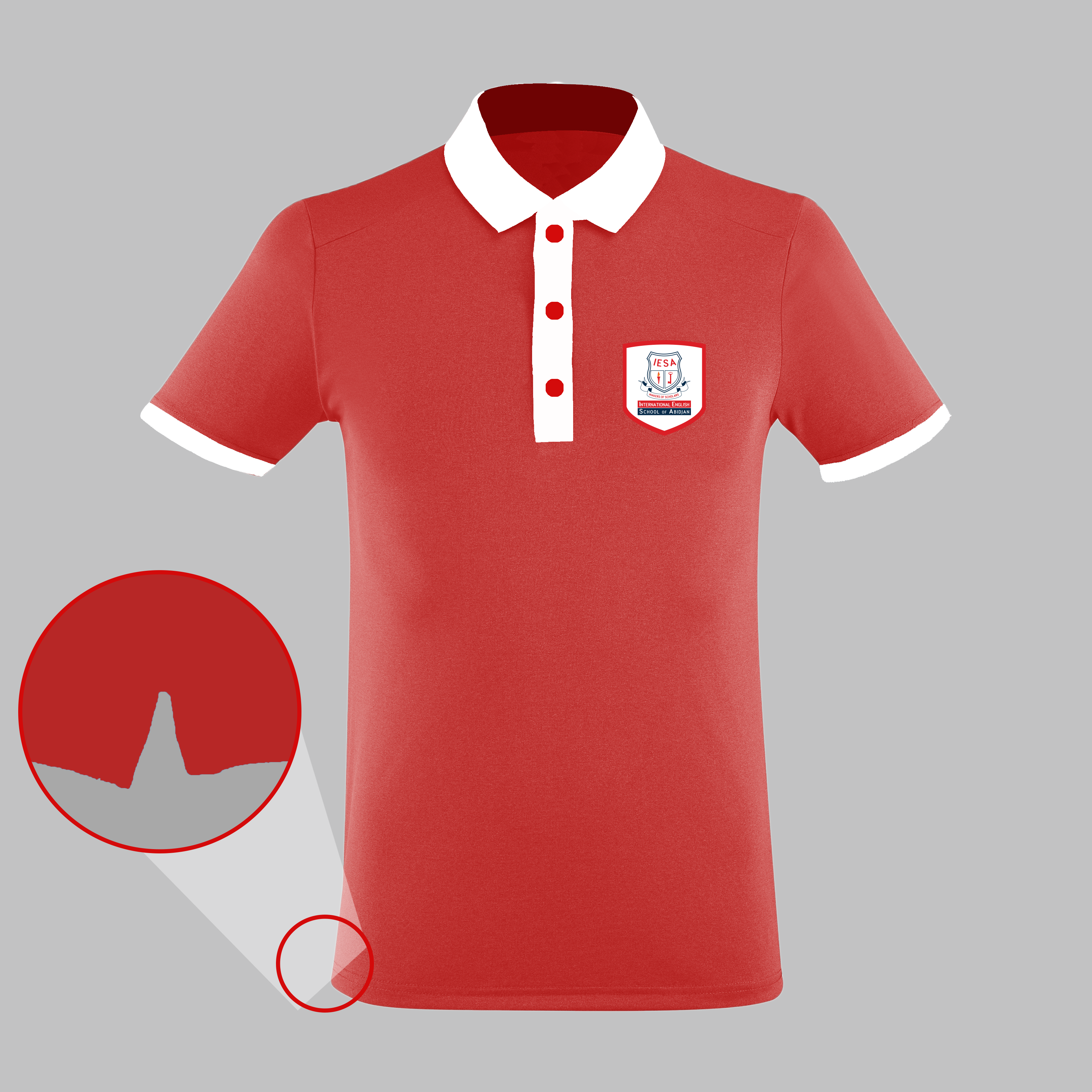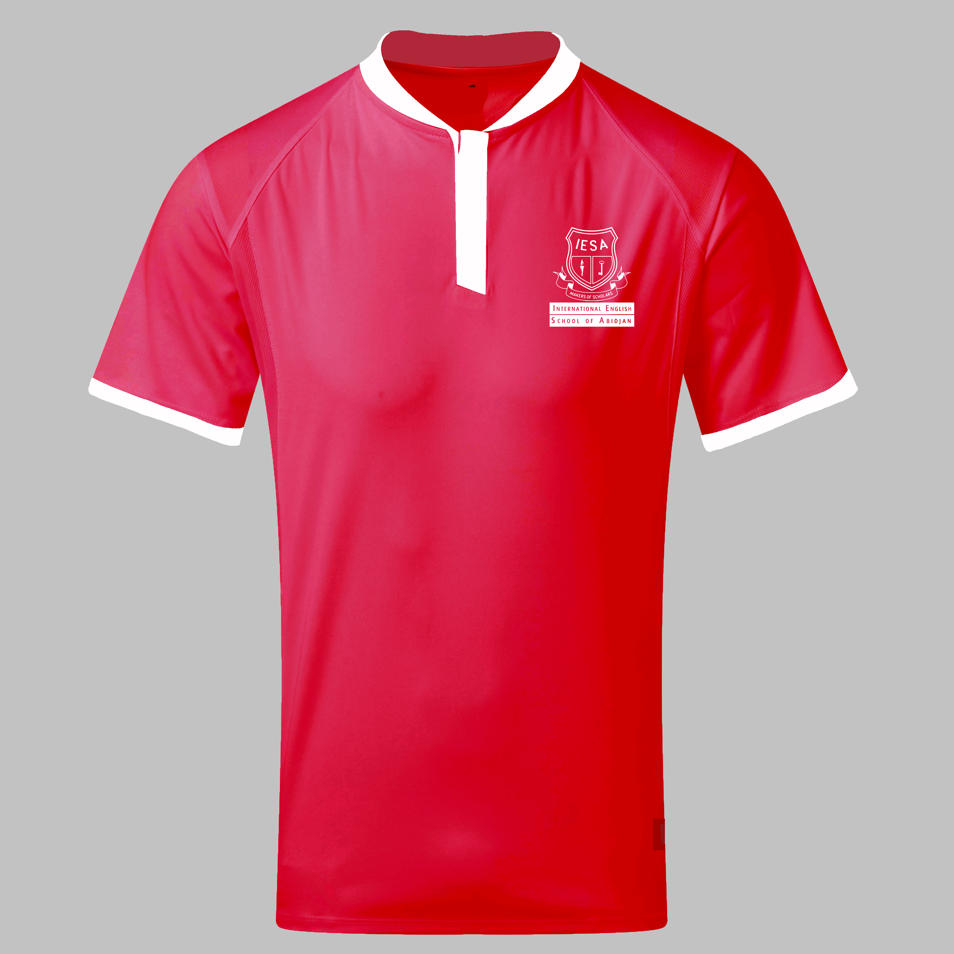 Red Short sleeve White collar and sleeve edge Embroidered Primary crest on the left side of the chest Two/ three button front placket Embroidered school motto at the back Side slits