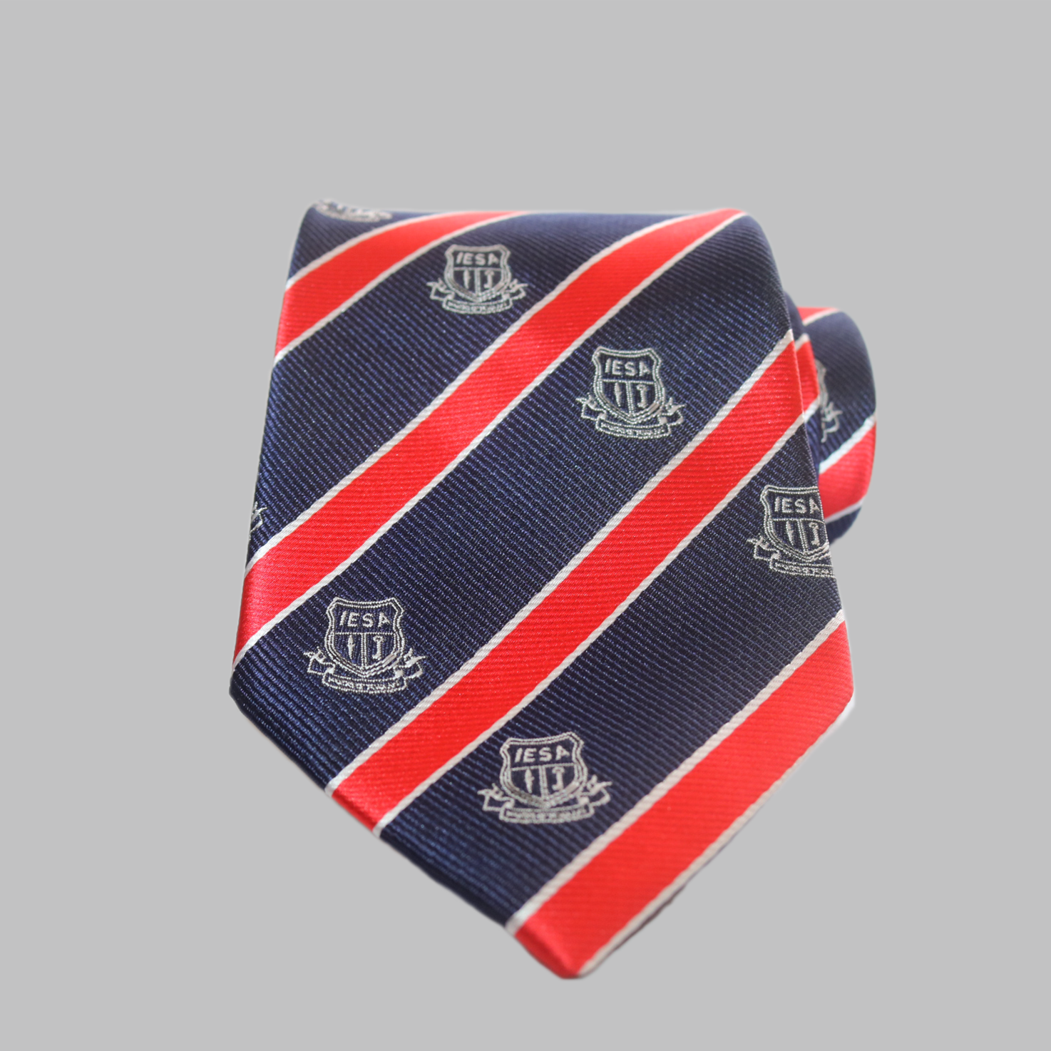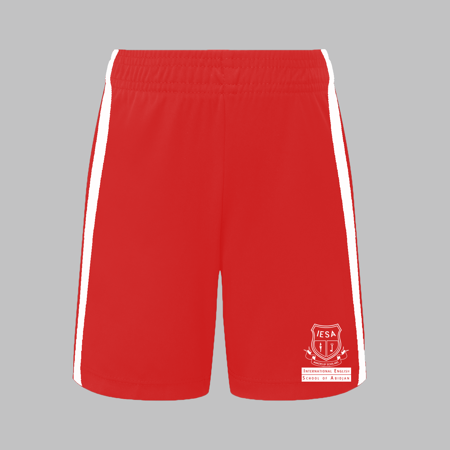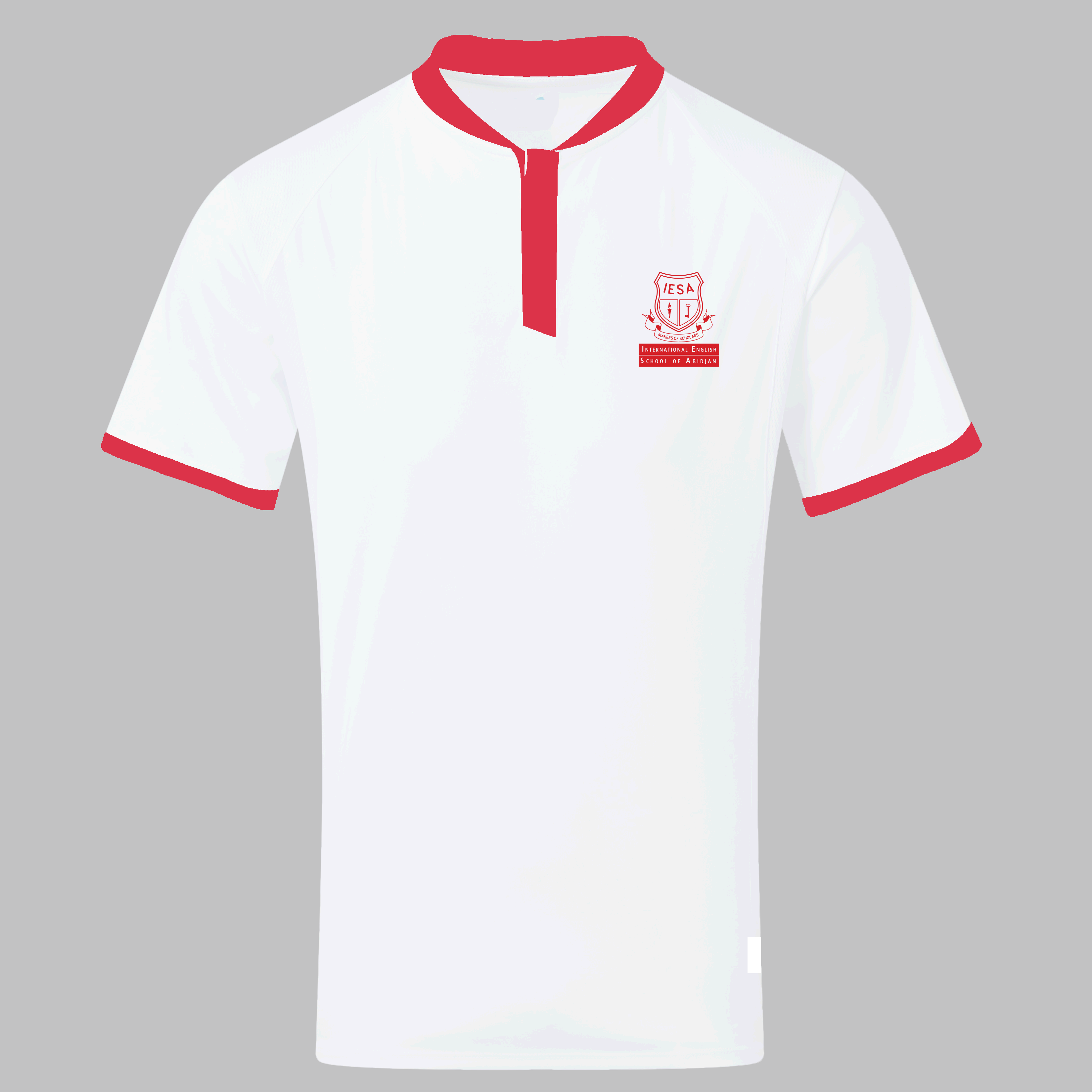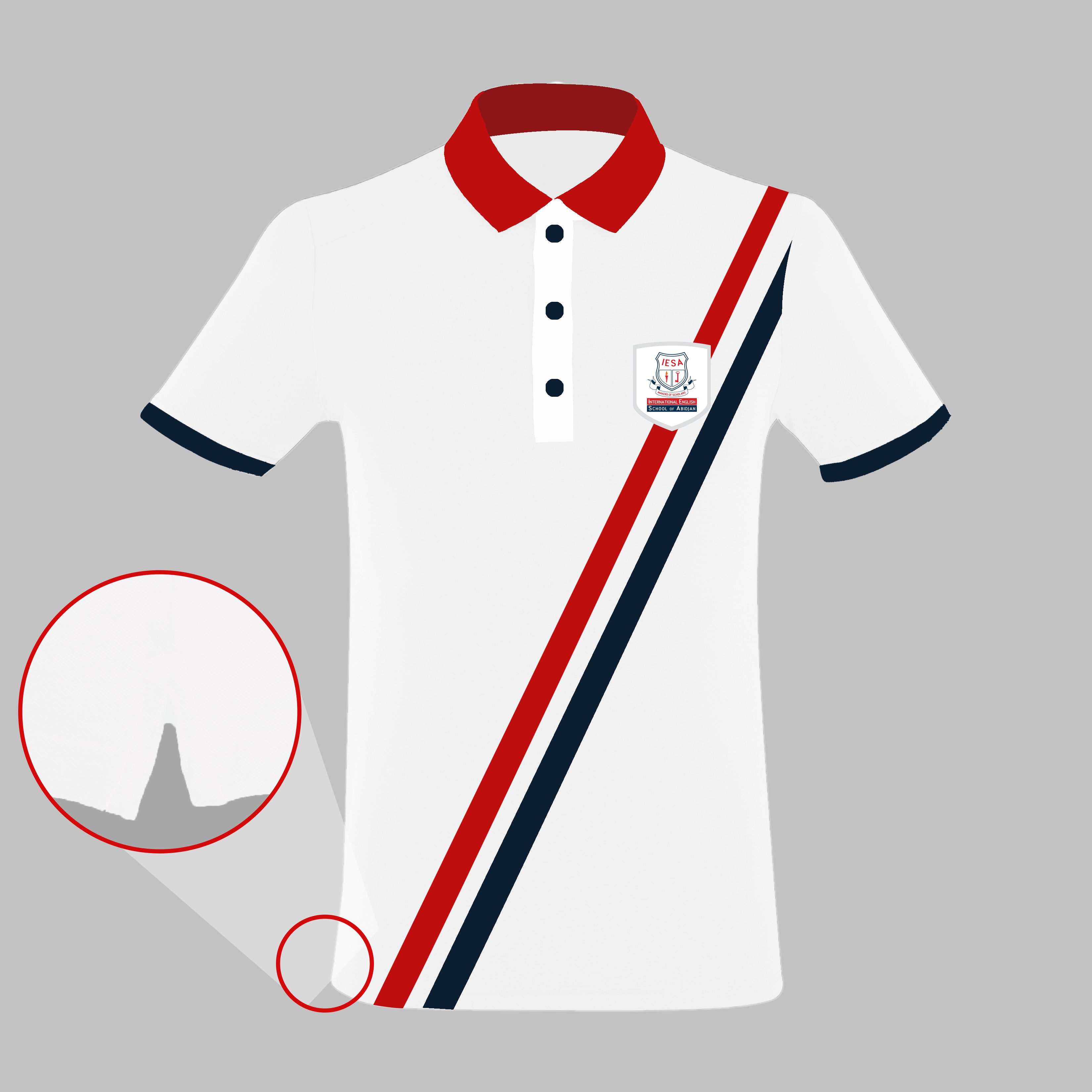 White Short sleeve Red ribbed collar Embroidered High School crest on the left side of the chest White placket with three blue button Embroidered school motto at the back Side vents Ribbed and Dark Blue-cuffed sleeve Button fastenings left facing 2 Diagonal Stripes red and dark blue (2.5 cm each)
